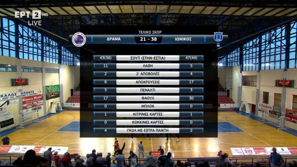 H αθηναϊκή ομάδα, χωρίς ξένο παίκτη στη σύνθεσή της, αιφνιδίασε τη Δράμα και κυριαρχώντας σε άμυνα κι επίθεση, έκλεισε το πρώτο ημίχρονο με 19-9. Οι γηπεδούχοι όχι μόνο δεν αντέδρασαν, αλλά είδαν το Ιωνικό να ανοίγει τη διαφορά, να έχει διπλό σκορ στο 45′ (28-14) και να φθάνει στη 2η νίκη της στο πρωτάθλημα με 38-21.