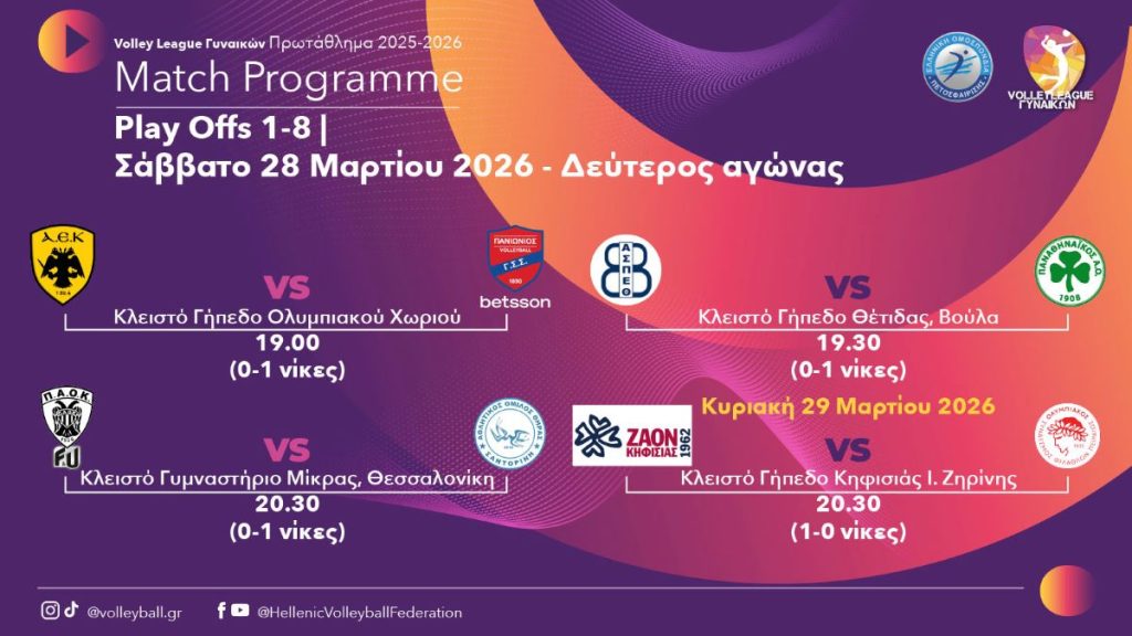 Το πρώτο σερβίς θα γίνει στο Ολυμπιακό Χωριό, όπου η ΑΕΚ θα υποδεχθεί τον Πανιώνιο Betsson. Οι κυανέρυθρες επικράτησαν με 3-0 σετ στον πρώτο αγώνα και βρίσκονται μία νίκη μακριά από την παρθενική τους πρόκριση στα ημιτελικά της Volley League γυναικών. Από την άλλη, η Ένωση θα επιδιώξει την ανατροπή, με τον Κώστα Ταμπουρατζή να έχει αμφίβολες τις Σταματία Κυπαρίσση, Ματέι Μπουρτέα και Εβίτα Ξηντάρα.