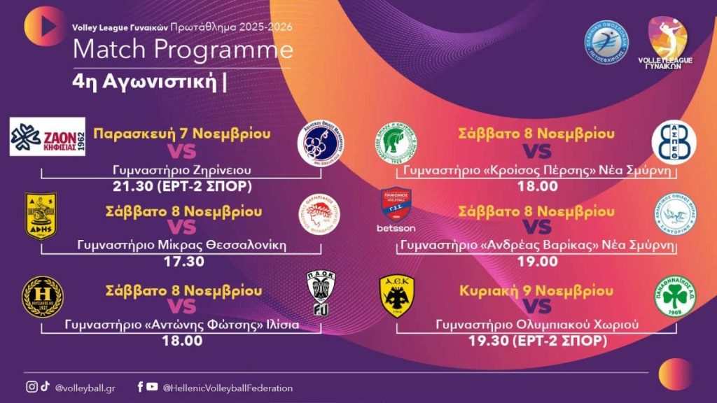 Η αρχή θα γίνει με τον αγώνα της Παρασκευής (7/11, 21:30) ΖΑΟΝ – ΑΟ Μαρκοπούλου Revoil, ενώ την Κυριακή δεσπόζει το ντέρμπι ΑΕΚ – Παναθηναϊκός.