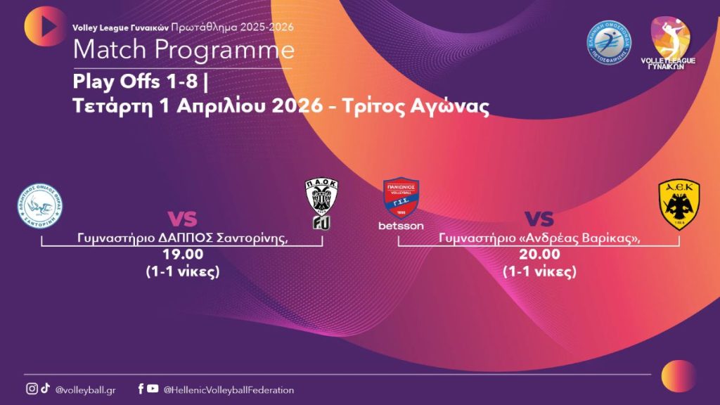 Η αρχή θα γίνει στη Σαντορίνη, με τον τοπικό ΑΟΘ να κοντράρεται με τον Δικέφαλο του Βορρά. Η γηπεδούχος ομάδα είχε επικρατήσει με 3-2 στο πρώτο ματς, με τον ΠΑΟΚ να απαντά στο κλειστό της Μίκρας όπου κέρδισε με 3-1, ενώ αυτή ήταν και η πρώτη του φετινή νίκη κόντρα στον ΑΟ Θήρας (είχε νικήσει και στα δύο ματς της κανονικής διάρκειας, αλλά και στον ημιτελικό του Κυπέλλου).