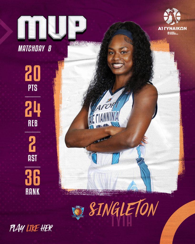 Η Αμάνι Σίνγκλετον στην νίκη του ΠΑΣ Γιάννινα με 73-61 επί του Παναθλητικού είχε 20 πόντους, 24 ριμπάουντ, 2 ασίστ, μία τάπα και συγκέντρωσε 36 στο σύστημα αξιολόγησης μετά από 36 λεπτά συμμετοχής. Από την άλλη η πλεϊμέικερ του Παναθλητικού είχε 9 πόντους 6 ριμπάουντ, 2 ασίστ, 3 κλεψίματα, μια τάπα και 14 στο σύστημα αξιολόγησης μετά από 33’ λεπτά συμμετοχής.