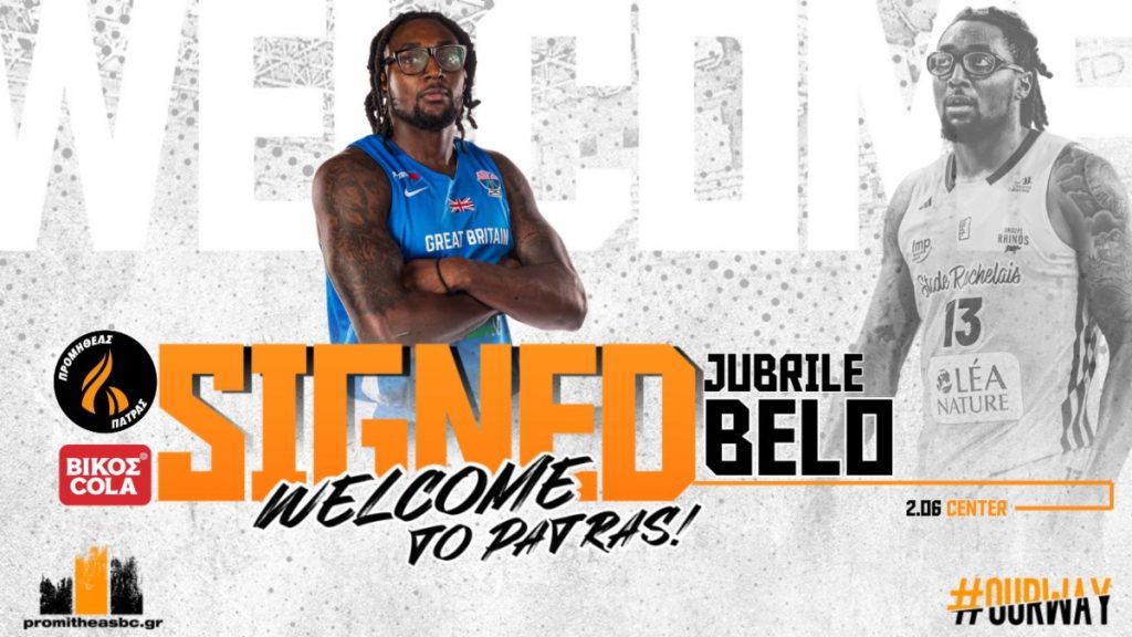 Καλωσορίζουμε τον Jubrile Belo στην μπασκετική οικογένεια του Προμηθέα Πάτρας και του ευχόμαστε να έχει υγεία και επιτυχίες με την ομάδα μας».