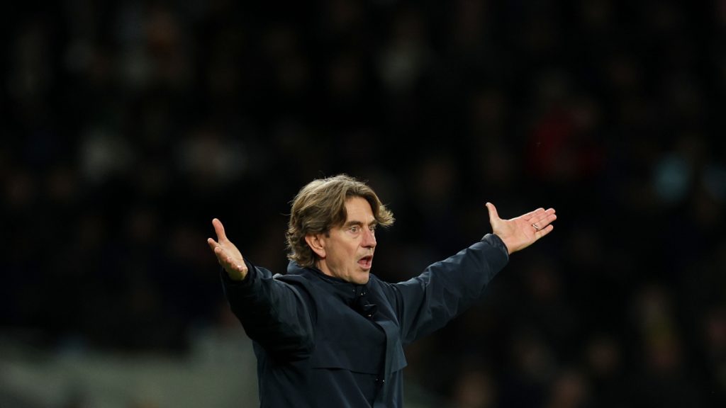 Tottenham’s head coach Thomas Frank gestures from the touchline during the English Premier League soccer match between Tottenham Hotspur and Fulham in London, Saturday, Nov. 29, 2025. (AP Photo/Ian Walton)