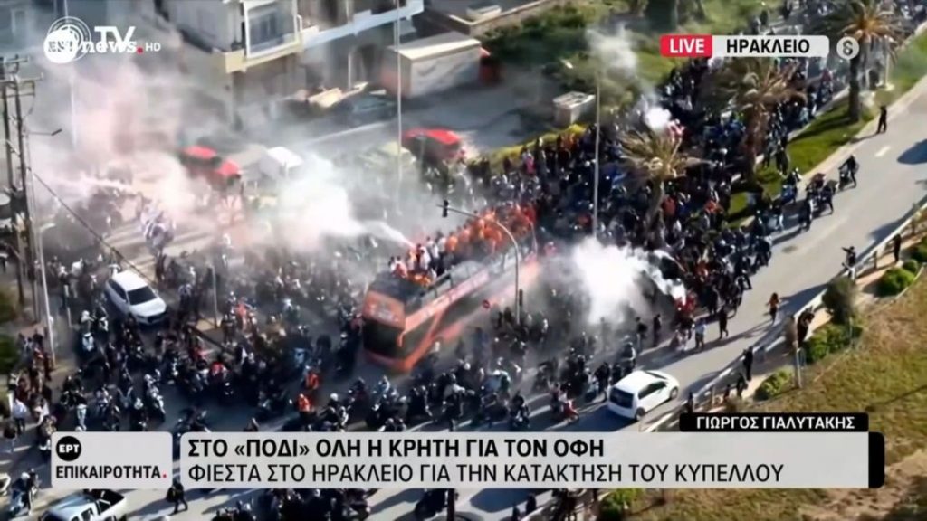 Ο ΟΦΗ κατέκτησε το δεύτερο Κύπελλο στην ιστορία του επικρατώντας με 3-2 του ΠΑΟΚ στον τελικό. Η κρητική ΠΑΕ ετοίμασε για τον κόσμο της ομάδας μια μέρα που θα τους μείνει αξέχαστη. Πιο συγκεκριμένα όλη η ομάδα ανέβηκε σε ένα ανοικτό λεωφορείο το οποίο κάνει βόλτα στο Ηράκλειο, με τον κόσμο να έχει δημιουργήσει μια λαοθάλασσα για να αποθεώσει τους θριαμβευτές του Βόλου.
