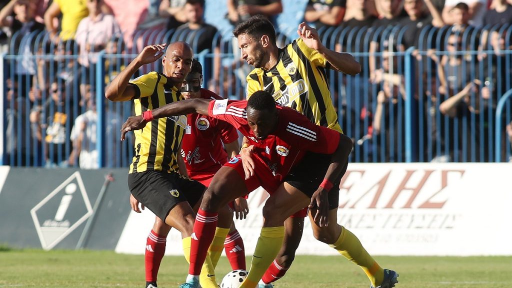 Η γηπεδούχος ομάδα, με πολλά προβλήματα και υπηρεσιακό προπονητή τον Γιώργο Κουδούνη, έκανε τρομερή προσπάθεια απέναντι στην ΑΕΚ. Μάλιστα, στο πρώτο ημίχρονο απείλησε δυο φορές με τον Χριστόπουλο, ενώ στο ίδιο διάστημα μεγαλύτερη ευκαιρία για την ΑΕΚ ήταν το σουτ το δοκάρι από τον Κουτέσα στο 23′. Οι “κιτρινόμαυροι” είχαν άλλη μια καλή στιγμή στο 38′, με τον γκολκίπερ Τσιλιγγίρη να σταματά στην ίδια φάση την κεφαλιά του Γκρούγιτς κι εν συνεχεία το σουτ του Πιερό.