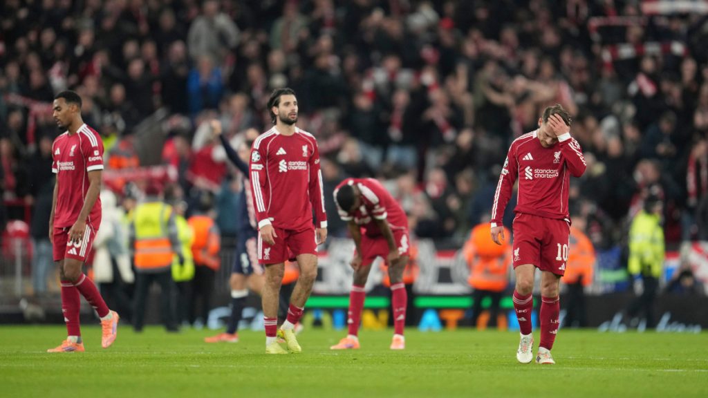 Liverpool’s Alexis Mac Allister, right, reacts after the Champions League opening phase soccer match between Liverpool and PSV in Liverpool, England, Wednesday, Nov. 26, 2025. (AP Photo/Jon Super)