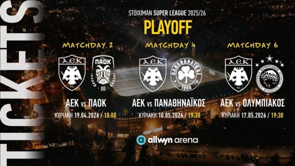 «Η ΠΑΕ ΑΕΚ ανακοινώνει ότι άρχισε η διάθεση των εισιτηρίων για τους αγώνες της ομάδας μας στη διαδικασία των Playoff του Πρωταθλήματος Stoiximan Super League 2025-26, που θα διεξαχθούν στην ALLWYN Arena.