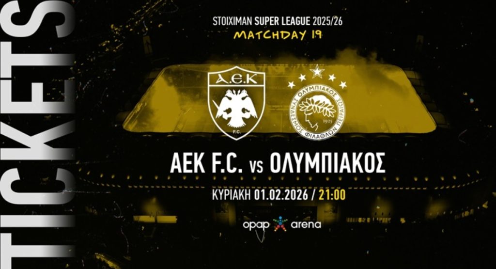 Η ΠΑΕ ΑΕΚ ανακοινώνει ότι άρχισε η διάθεση των εισιτηρίων για το ματς της 19ης αγωνιστικής του Πρωταθλήματος με αντίπαλο τον Ολυμπιακό, που θα διεξαχθεί την Κυριακή 1η Φεβρουαρίου στις 21:00, στην OPAP Arena.