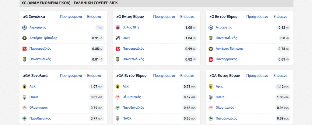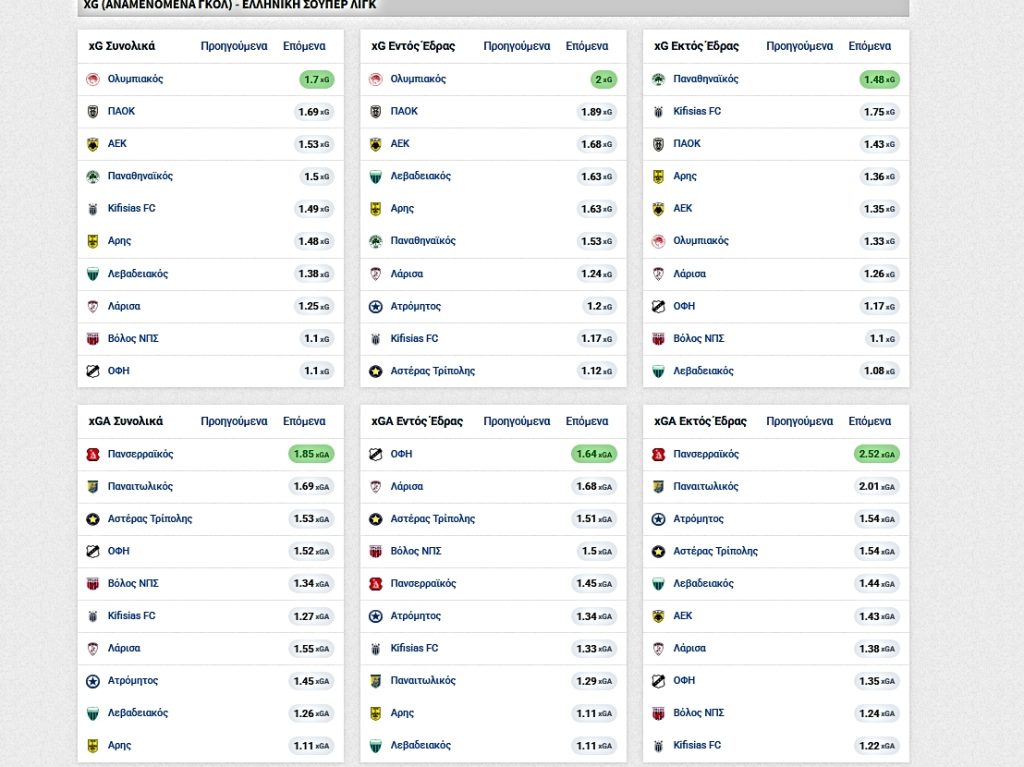Η ομάδα με το καλύτερο xG εκτός έδρας για αυτή τη σεζόν είναι ο Παναθηναϊκός, που κάνει ευκαιρίες 1.48 γκολ ανά αγώνα σε γήπεδο αντίπαλης ομάδας. Η ομάδα με το χειρότερο xG εκτός έδρας για αυτή τη σεζόν είναι ο Πανσερραϊκός, με 0.61 γκολ ανά αγώνα σε γήπεδο αντίπαλης ομάδας.