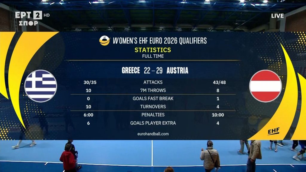 Η ελληνική ομάδα βρέθηκε από το ξεκίνημα πίσω στο σκορ, καθώς δυσκολεύτηκε πολύ να βρει λύσεις στην επίθεση. Η Αυστρία προηγήθηκε 7-2 στο 16ο λεπτό και 9-3 στο 19΄, διαφορά που συντήρησε χωρίς ιδιαίτερες δυσκολίες ως το ημίχρονο (15-9). Στη συνέχεια, με την Καταρίνα Πάντζα να αναλαμβάνει… δράση, οι φιλοξενούμενες έφτασαν στο +11 (23-12 στο 41΄) και ουσιαστικά «καθάρισαν» το παιχνίδι. Στο τελευταίο δεκάλεπτο, η εθνική κατάφερε να μειώσει σε 27-21, με δύο διαδοχικά πέναλτι της Ολυμπίας Ανδρίτσου, ένα γκολ της τερματοφύλακα Μάγδας Κεπεσίδου σε κενή εστία και ένα της Αγνής Ζυγούρα, για να ολοκληρωθεί το παιχνίδι με σκορ 22-29.